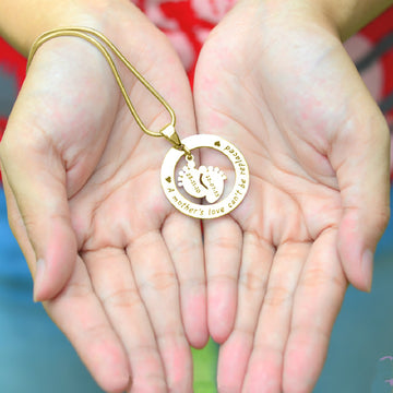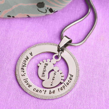 You know, your kids are always going to be your little babies. No matter how big they get, they're always going to be the ones that have the deepest footprints in your heart. That's why I'm the best necklace. I'll help you remember their once tiny little footsies. I'm the bigger version to my sister necklace. I've got two divine little feet that can inscribe names and birthdates on. As your family grows, you can add more footsies to the necklace. I'm here to remind you that a mother's love Can't Be Replaced. So choose me for yourself, or choose me for your mumma. Remind her how much you cherish her.