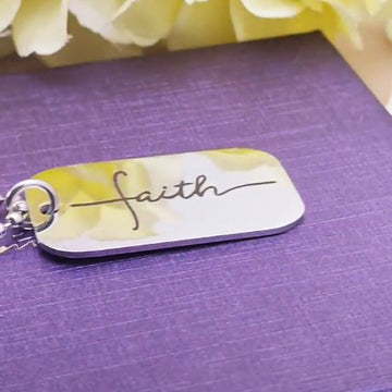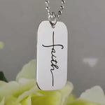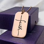 Introducing our Faith Dog Tag Necklace, a beautiful and meaningful piece of jewellery that will remind you to always have faith. Available in silver, gold, or rose gold, this necklace can be customised with your choice of words on the front and back, or choose from our default inscriptions.