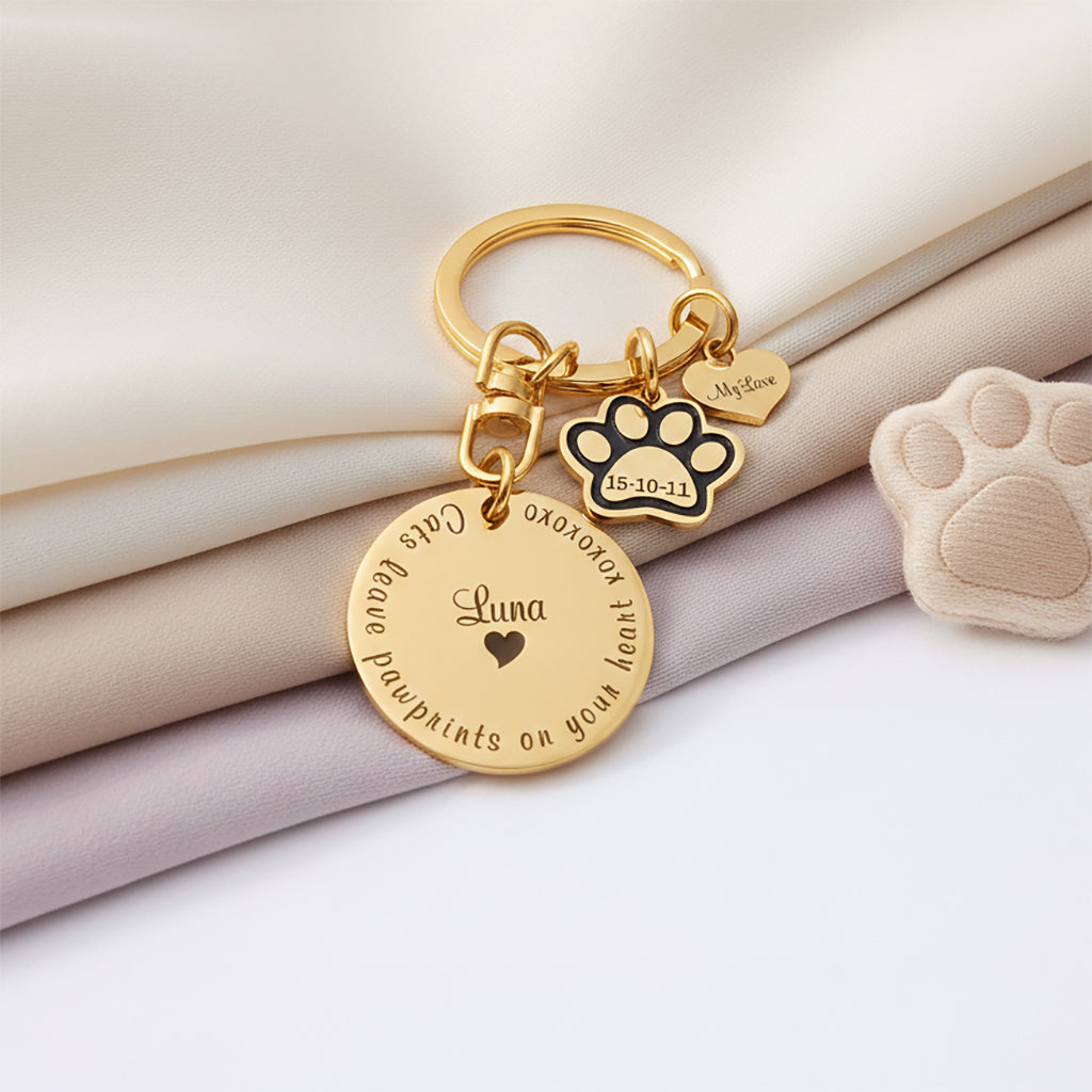 Prints on my heart keyring in gold tone with engraved disc and paw charm. belle fever custom pet loss gift keepsake.