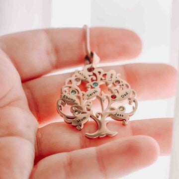 The Tree of My Life Birthstones personalised necklace with names is a unique and luxurious piece of jewellery that symbolises family ties. Crafted with high-quality materials, this necklace is available in silver, gold, or rose gold. The exquisite design of this necklace features a birthstone inside the tree-shaped pendant, adding an extravagant touch to its beauty.